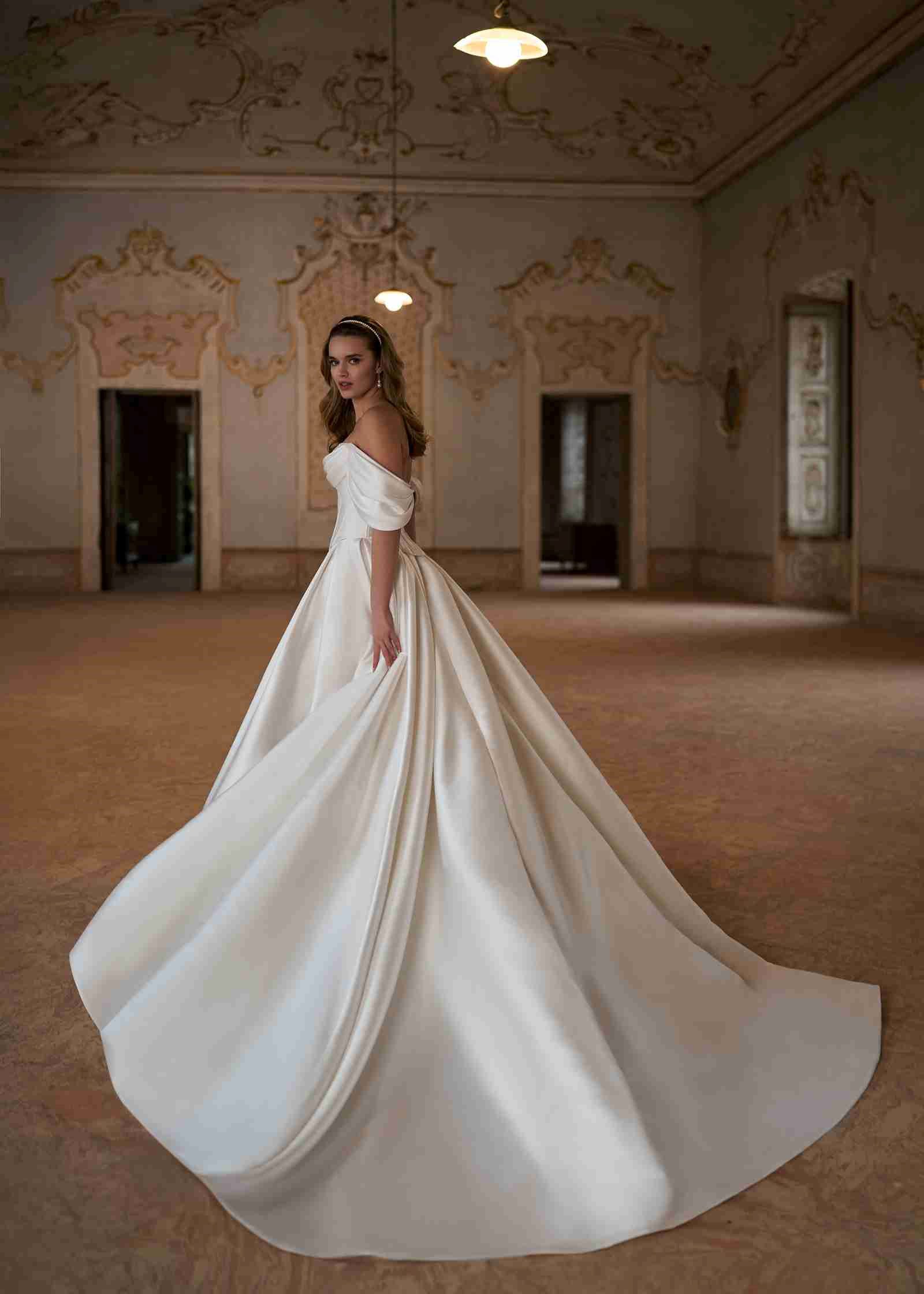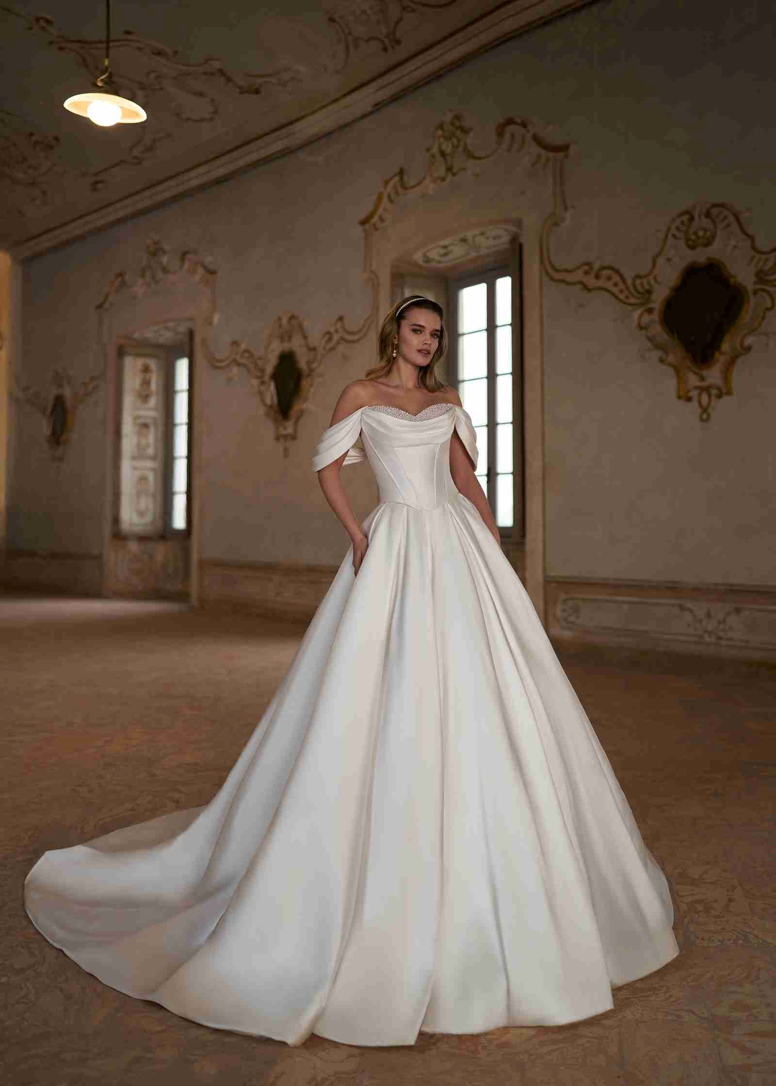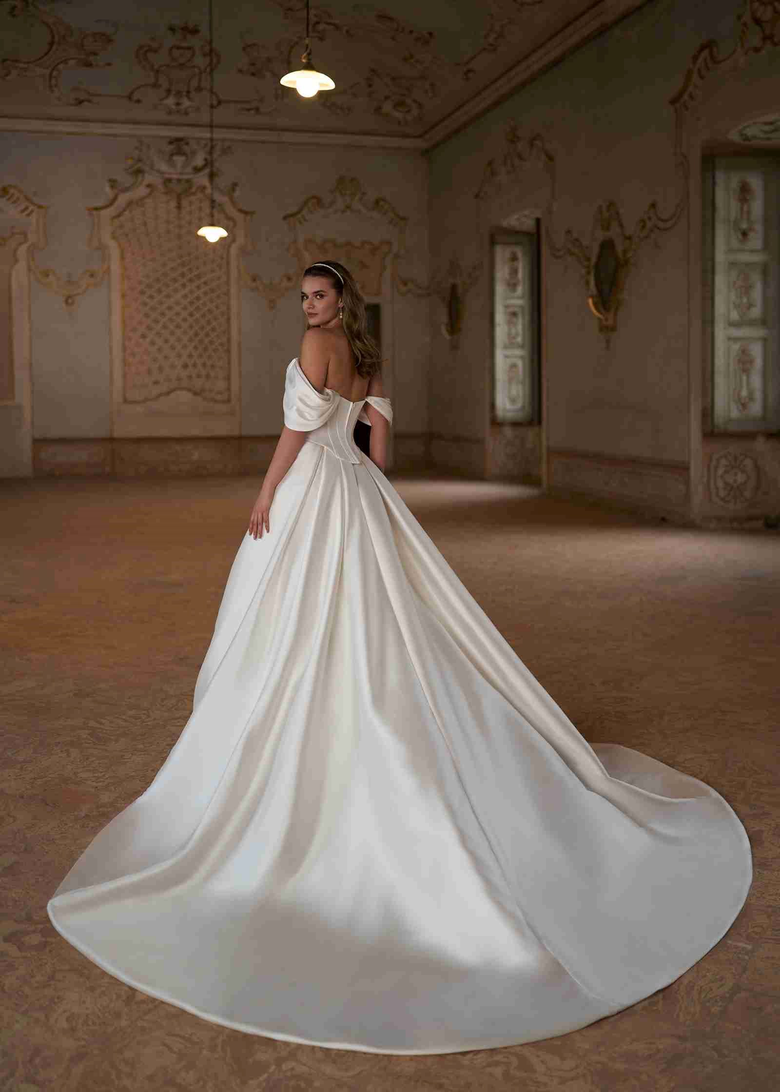 Nirit-toppen fra Herve Paris er en hyldest til romantisk overdådighed. Det elegante, draperede off-shoulder design smyger sig yndefuldt omkring skuldrene og skaber et fortryllende, kongeligt udtryk. Toppen har en smuk, struktureret korsetform, der fremhæver taljen og giver et feminint, sofistikeret look. Den indbyggede perlekant tilfører netop det rette strejf af vintageglamour og understreger brudens naturlige ynde. Nirit passer perfekt til de eksklusive Mix & Match-nederdele fra Herve Paris og er ideel til brude, der drømmer om et personligt og storslået udtryk med fuld bevægelsesfrihed og wow-effekt.