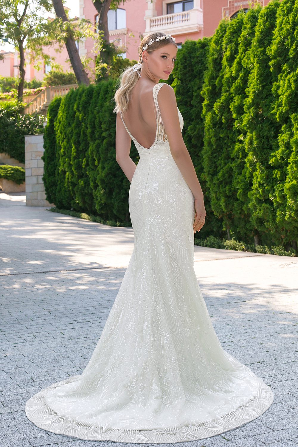 Den dybe V-udskæring og de brede stropper giver et sofistikeret look, mens den åbne ryg tilføjer en sensuel elegance. Den figursyede silhuet fremhæver kroppen på smigrende vis og glider ud i en let og flydende flare-nederdel, der afsluttes med en delikat slæb.