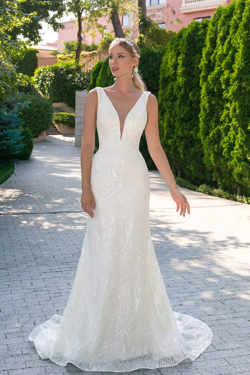 Drømmer du om en brudekjole, der kombinerer glamour og elegance? Monica Loretti 1032 er en fortryllende fit & flare-kjole, designet til at fremhæve kurver med raffineret stil. Kjolen er dækket af gnistrende geometriske perlebroderier, der skaber en unik og luksuriøs effekt, perfekt til bruden, der ønsker at skinne.