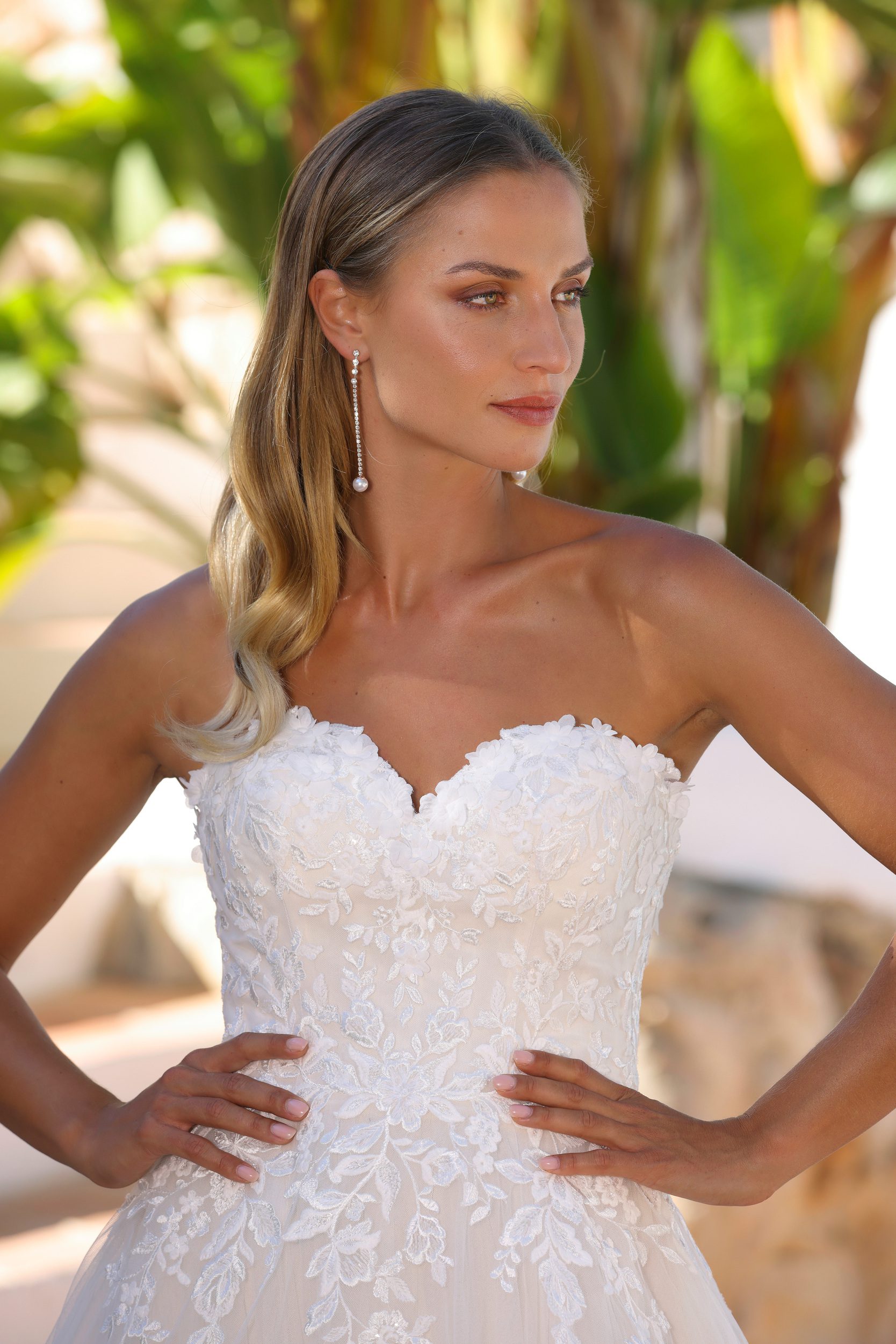 Anna fra Azuree er en betagende ball gown brudekjole, der emmer af romantik og luksus. Den stropløse, hjerteformede blondeoverdel er dekoreret med fine 3D-blomster og delikate perledetaljer, som elegant smyger sig ned over taljen og glider over i et lag-på-lag skørt af let tyl. Med sin åbne ryg og dramatiske, blondekantede slæbe er Anna både klassisk og drømmende – perfekt til bruden, der ønsker et ægte prinsesse-look med moderne kant. Fra haveselskaber til slotte – Anna skaber magi, hvor end du siger “ja”.