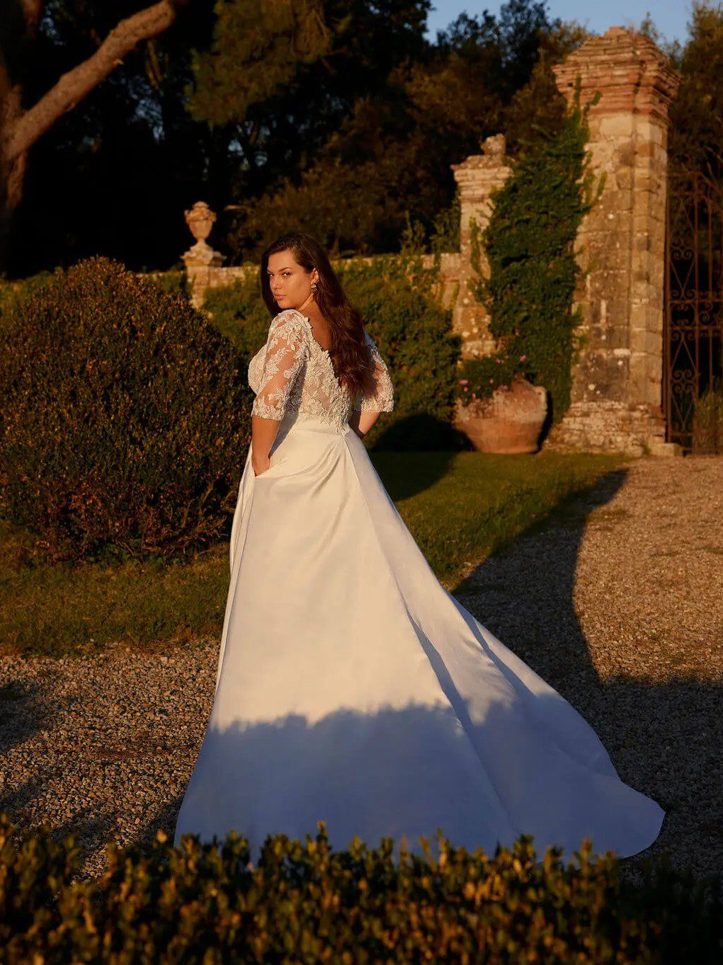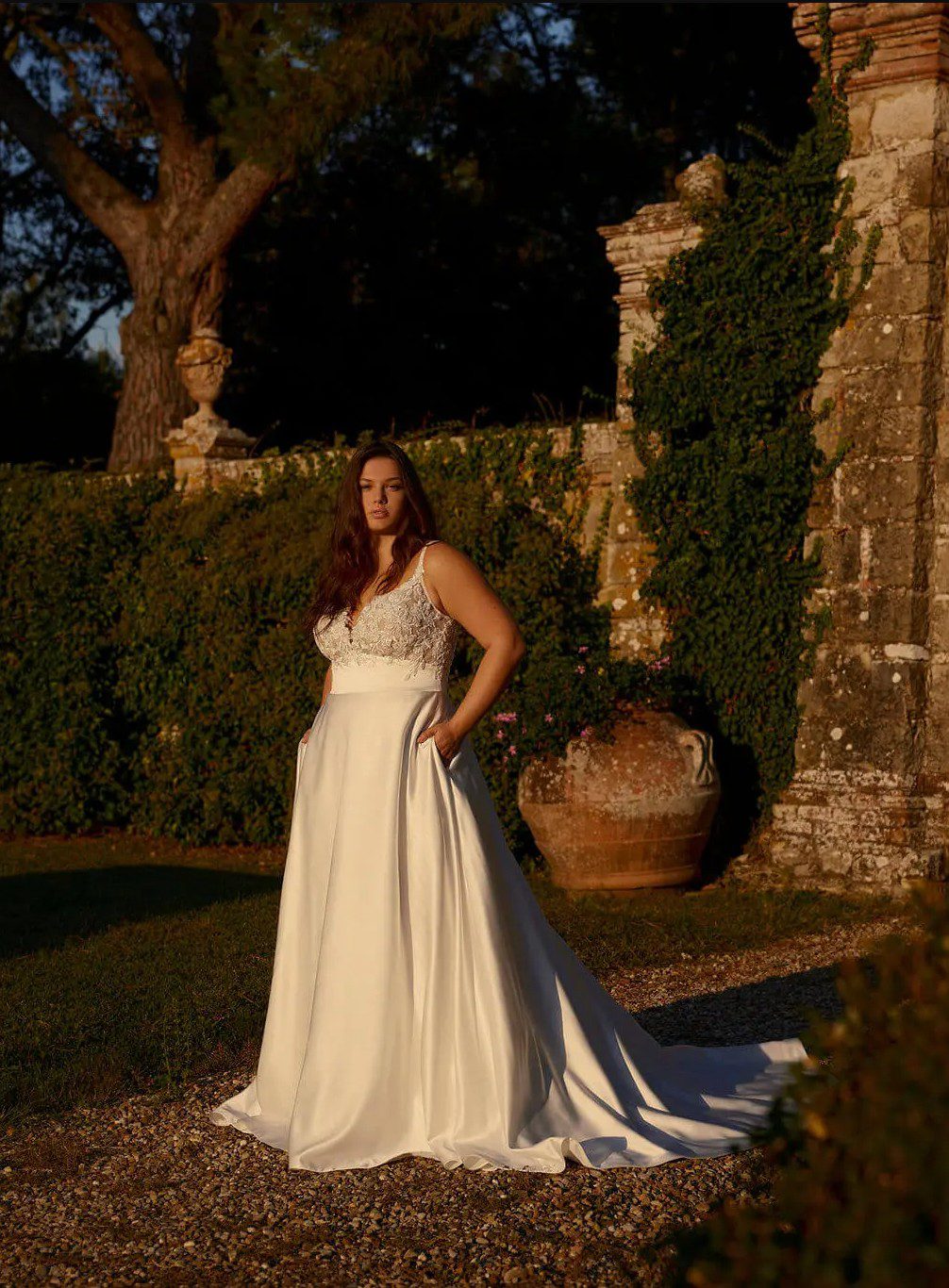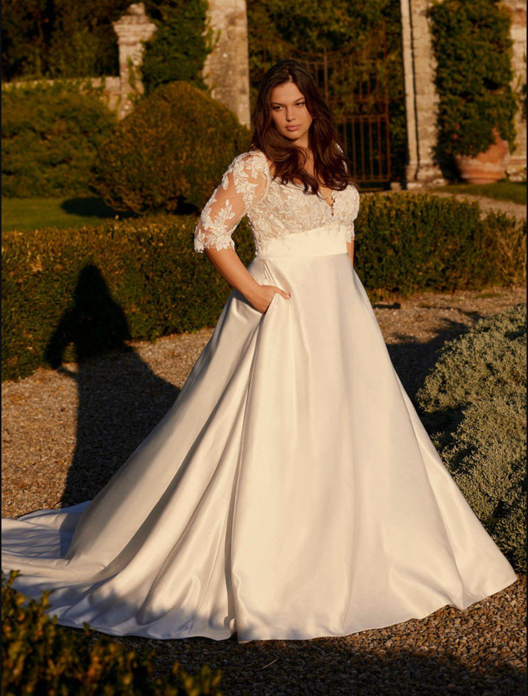 Dreamer-C fra Modeca er indbegrebet af tidløs elegance og moderne komfort. Denne luksuriøse A-line brudekjole kombinerer en skinnende satin nederdel med en romantisk blondetop, der smyger sig yndefuldt over barmen og fremhæver din naturlige skønhed. Kjolen har en blød V-udskæring og delikate stropper, samt muligheden for at tilføje blondeærmer for et ekstra romantisk udtryk. Lommer i skørtet tilfører et moderne og afslappet twist, perfekt til den stilbevidste brud. Dreamer-C er skabt til dig, der drømmer om en kjole, hvor glamour møder ubesværet elegance.