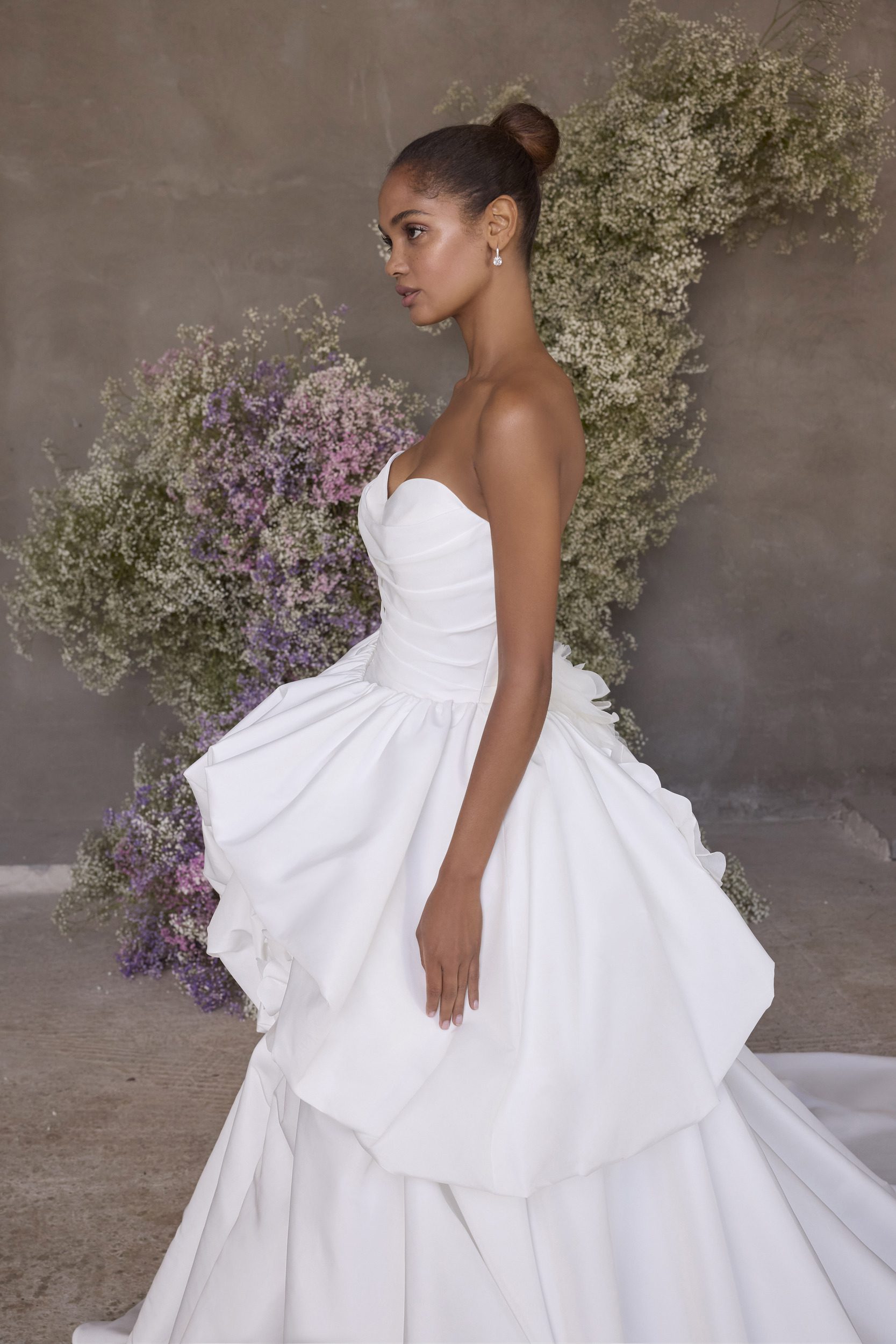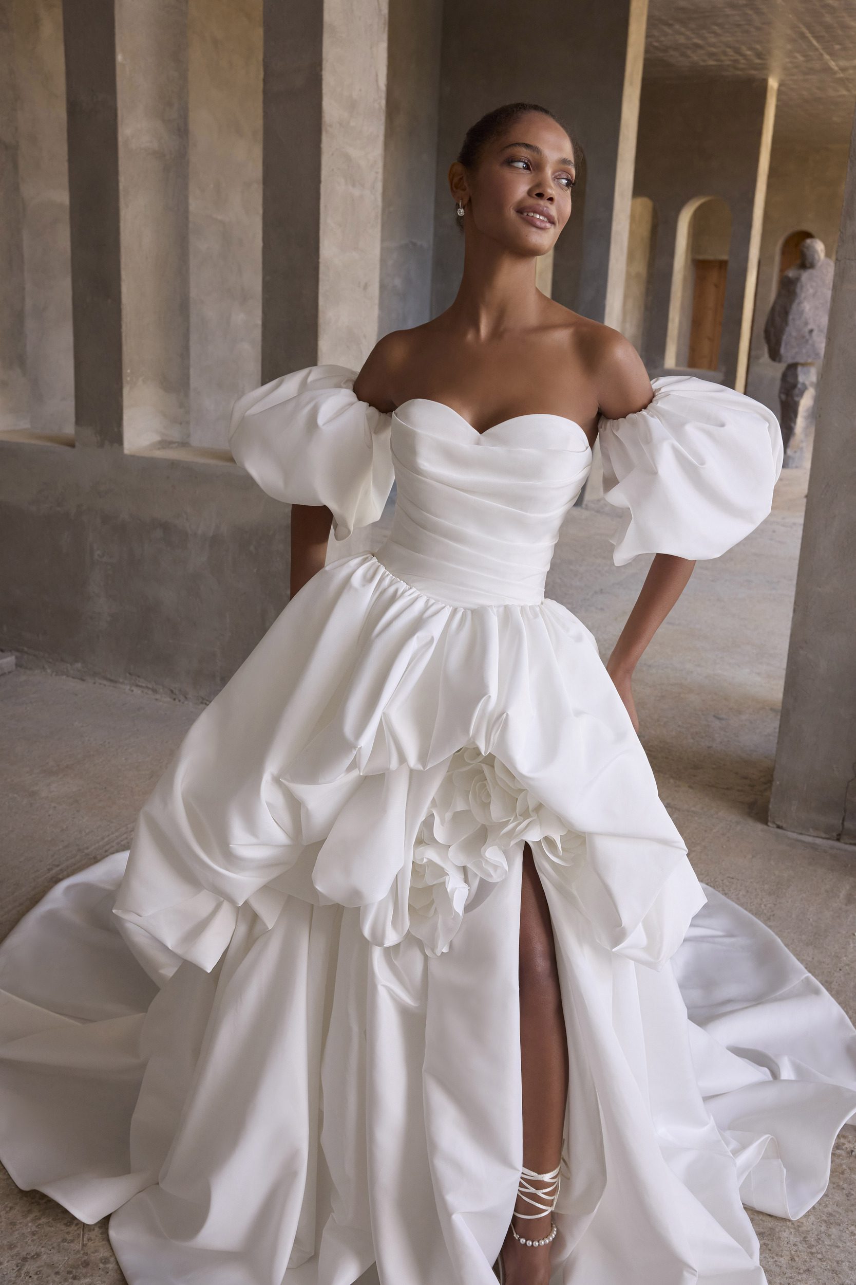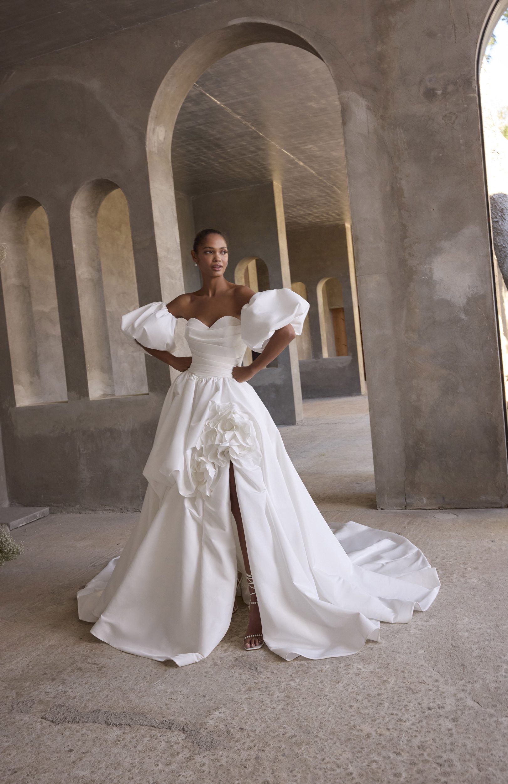Træd ind i din egen kærlighedshistorie iført den spektakulære Nereida 2930 fra Mori Lee. Denne overdådige Ball Gown-kjole kombinerer klassisk romantik med moderne drama og et strejf af eventyr. Det stropløse sweetheart corsage-liv er smigrende draperet og munder ud i en fantasifuld, voluminøs skørtstruktur med unikke 3D blomsterdetaljer og draperinger, der skaber dybde og bevægelse. Kjolens overdådige silhuet forstærkes af den royale slæb og de aftagelige ballonærmer, som tilfører et strejf af couture. Nereida 2930 er skabt til bruden, der ønsker at imponere – og fortrylle.