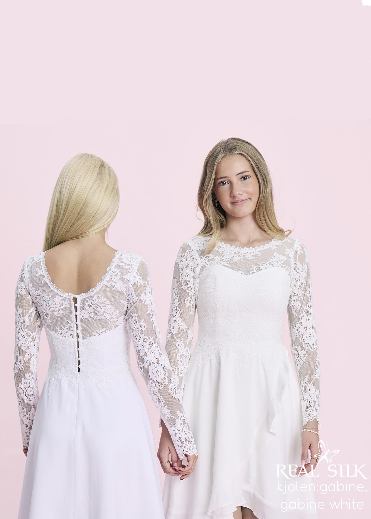 Konfirmationskjolen Gabine fra Real Silk er indbegrebet af romantisk elegance. Den smukke blondeoverdel med lange, transparente ærmer giver et delikat og feminint udtryk, mens den bløde A-line nederdel med asymmetrisk fald skaber bevægelse og lethed. Den fine knaplukning bagpå fuldender designet med klassisk charme, og de diskrete blondekanter understreger kjolens tidløse stil. Gabine er den perfekte kjole til konfirmanden, der ønsker et moderne, men stadig eventyrligt look, hvor enkelhed og detaljer går hånd i hånd.